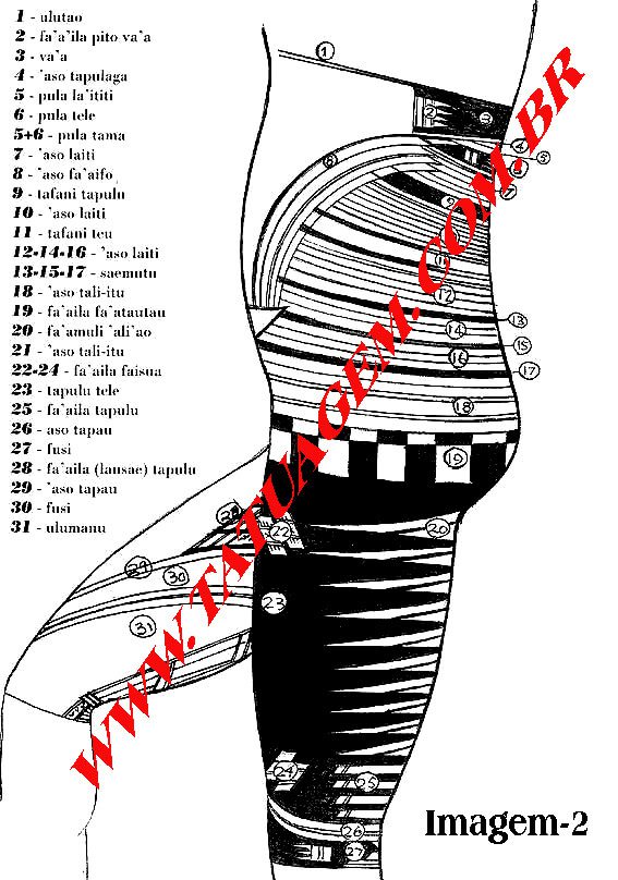 As linhas e decorações representadas abaixo são tatuadas nas pernas, se estendendo até o abdômen e a região lombar. Elas simbolizam códigos de conduta, a responsabilidade com a família e os rituais de iniciação dos jovens na vida comunitária.