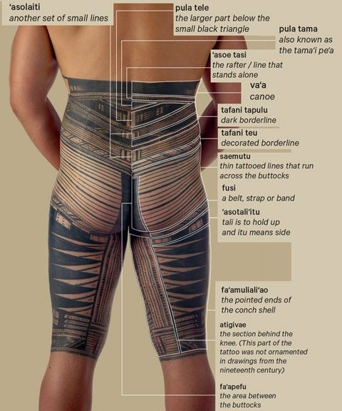As tatuagens samoanas não são destinadas a manifestar rebeldia, mas sim a harmonia, o patriotismo, a responsabilidade e a consciência das próprias capacidades e limitações. O foco está no construir e no desenvolvimento, com os símbolos projetados para refletir a evolução mental e hierárquica.